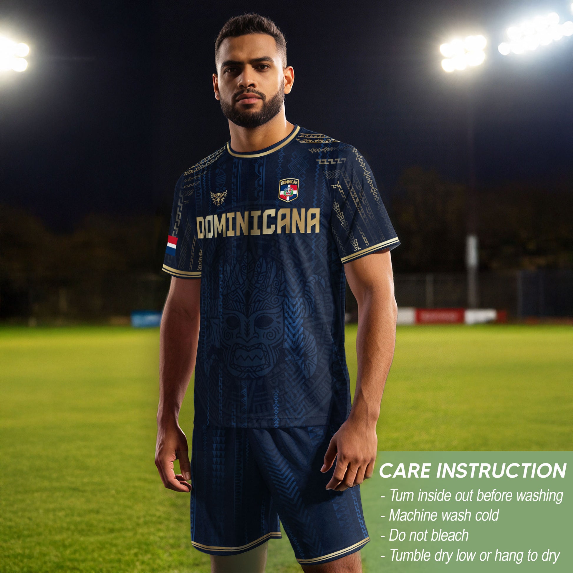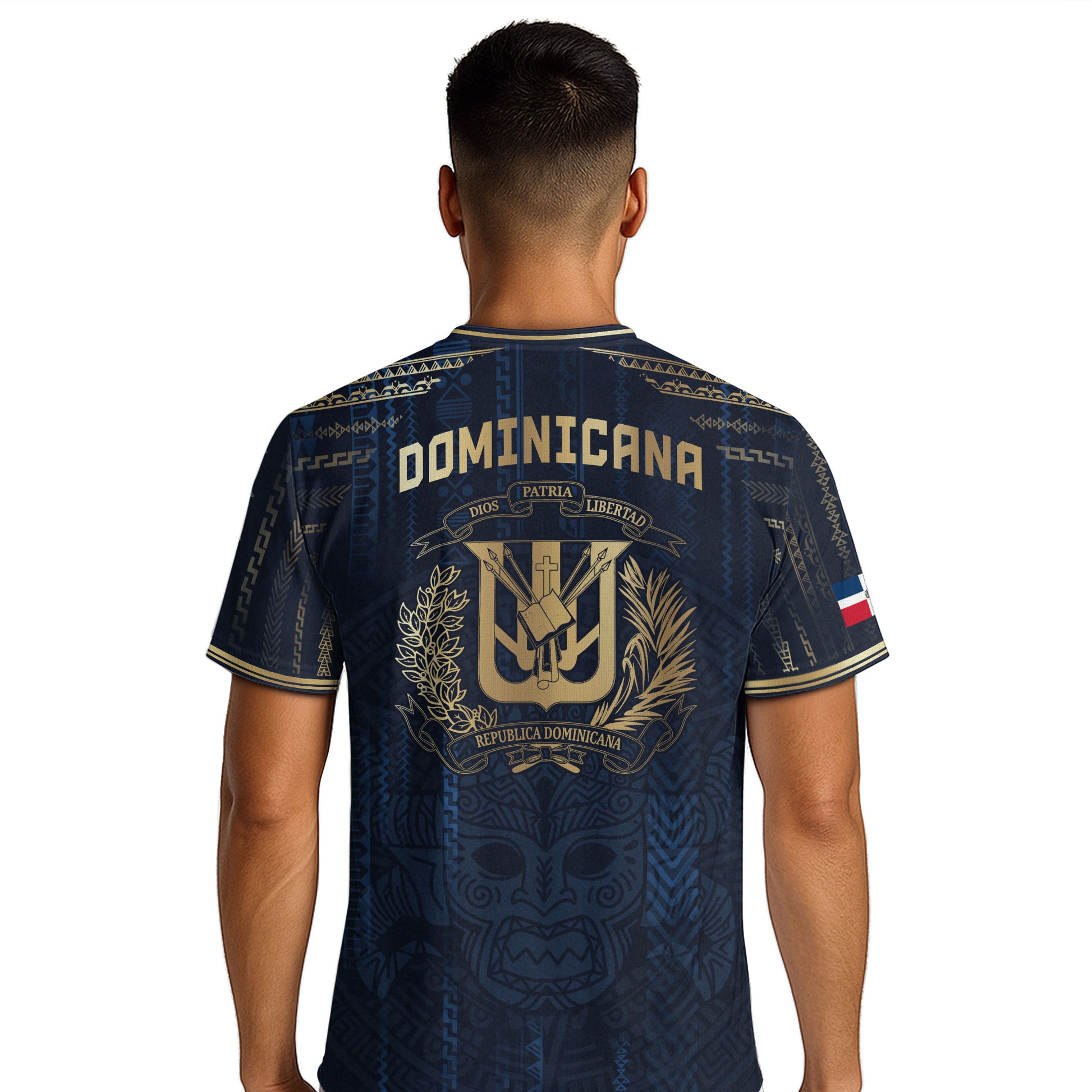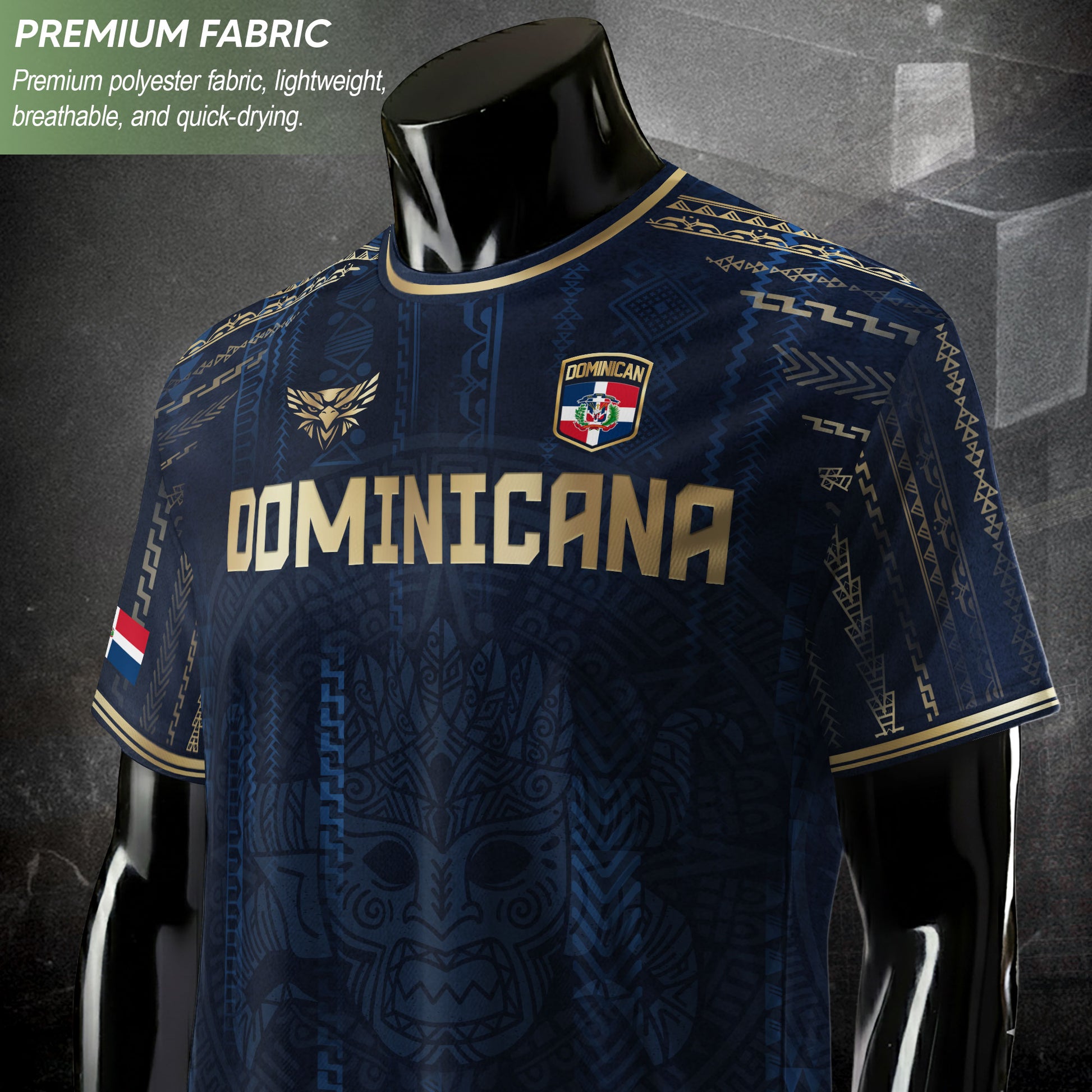 Combining navy and gold tones, this soccer jersey highlights Dominican heritage, cultural unity, and national pride. It reflects the traditions and values that shape Dominican culture.