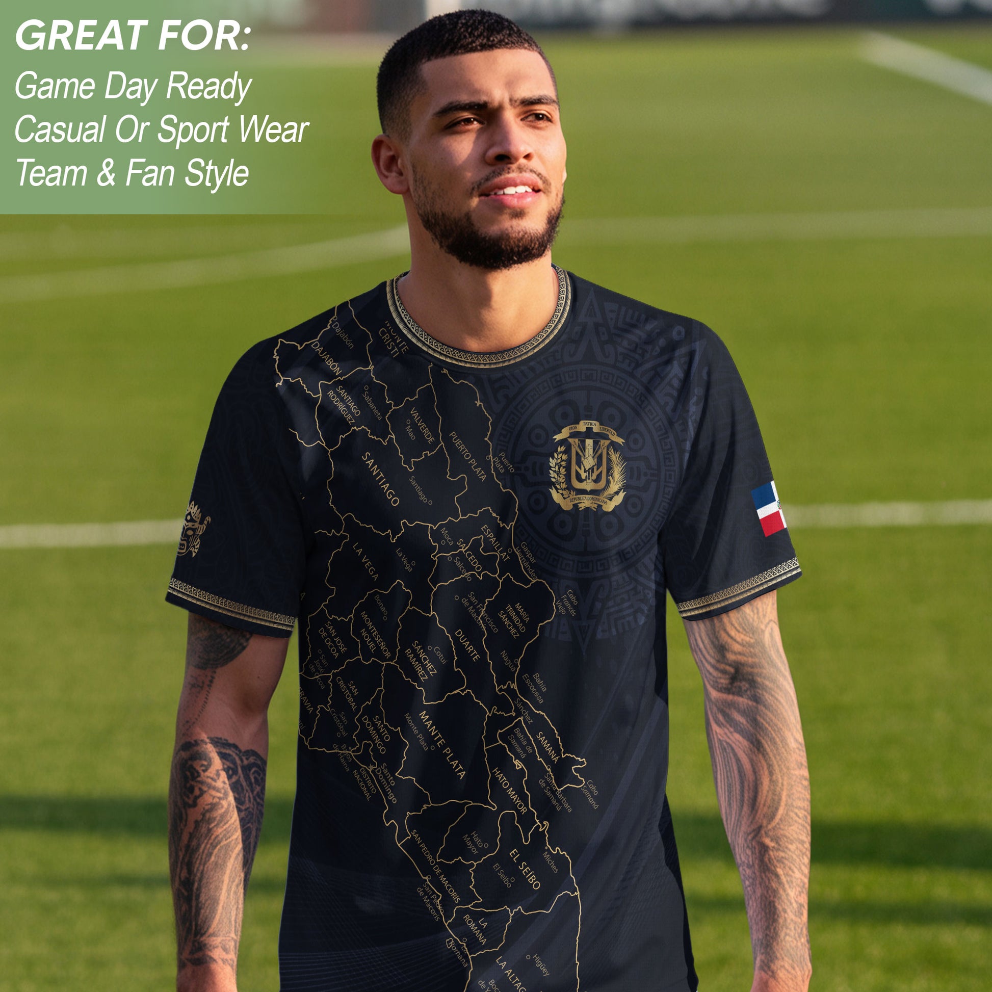 Designed to honor Dominican roots, this black and gold soccer jersey reflects cultural pride, unity, and a deep connection to shared heritage. It celebrates the values and traditions that shape Dominican identity.